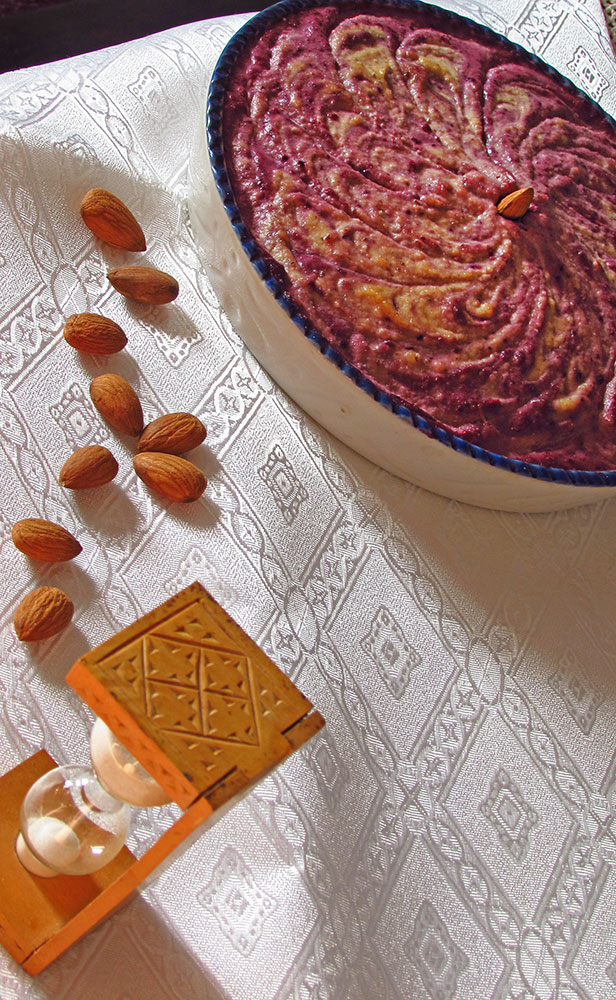 For filling we again used dates. We adore them! Also, we used soaked cashews, lemon juice and zest. That is the “white” part of filling, which, once blended, we put a part of it aside. In the remaining amount we added mixed berries.
