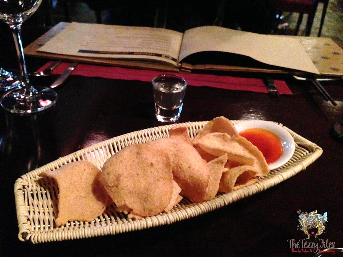 While we decided on our orders, we were served a plate of prawn crackers with sweet chili sauce, and a shot glass of a Thai-style ginger juice.