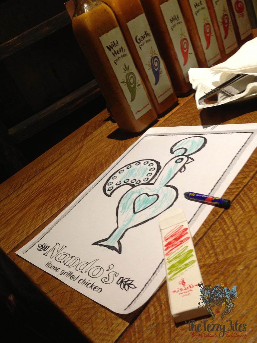 Nando’s is a child-friendly diner. While we busied ourselves over the menu options, Farasha was kept preoccupied with coloring the Barcelos Cockerel.