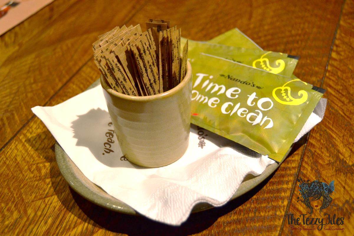 At the end of our delicious Nando’s dinner, we got wet-wipes; ‘Time to come clean’ they announced!