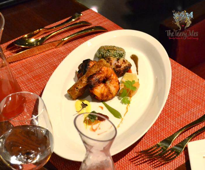 The platter consists of 6 delectable appetizers: hara bhara kebab, Kerala spiced tandoori salmon, lamb seekh kebab, murgh malai tikka, Rajasthani laal boti and tandoori tiger prawns.