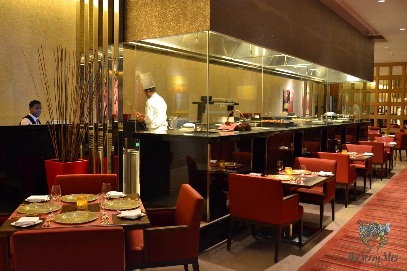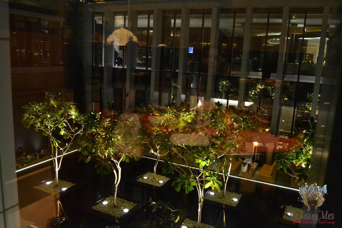 We sat by a window that looked into the hotel courtyard. The modern, urban lines of solid steel architecture that make up The Oberoi are juxtaposed with a small patch of trees that look surprisingly serene in this setting.
