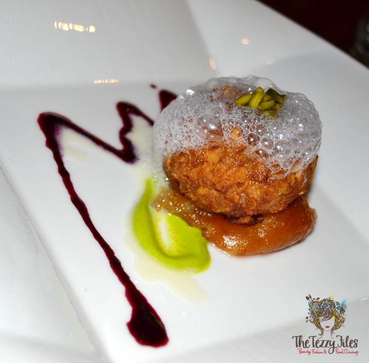 A scoop of malai kulfi (a decadently rich Indian ice-cream) has been deep-fried in a crunchy batter and served on top of a layer of deconstructed gulab jamun. An aesthetically pleasing vanilla foam laces the top of the ice-cream dome, and mildly tangy streaks of grape and passion-fruit coulis smear the plate to counteract the sweetness.