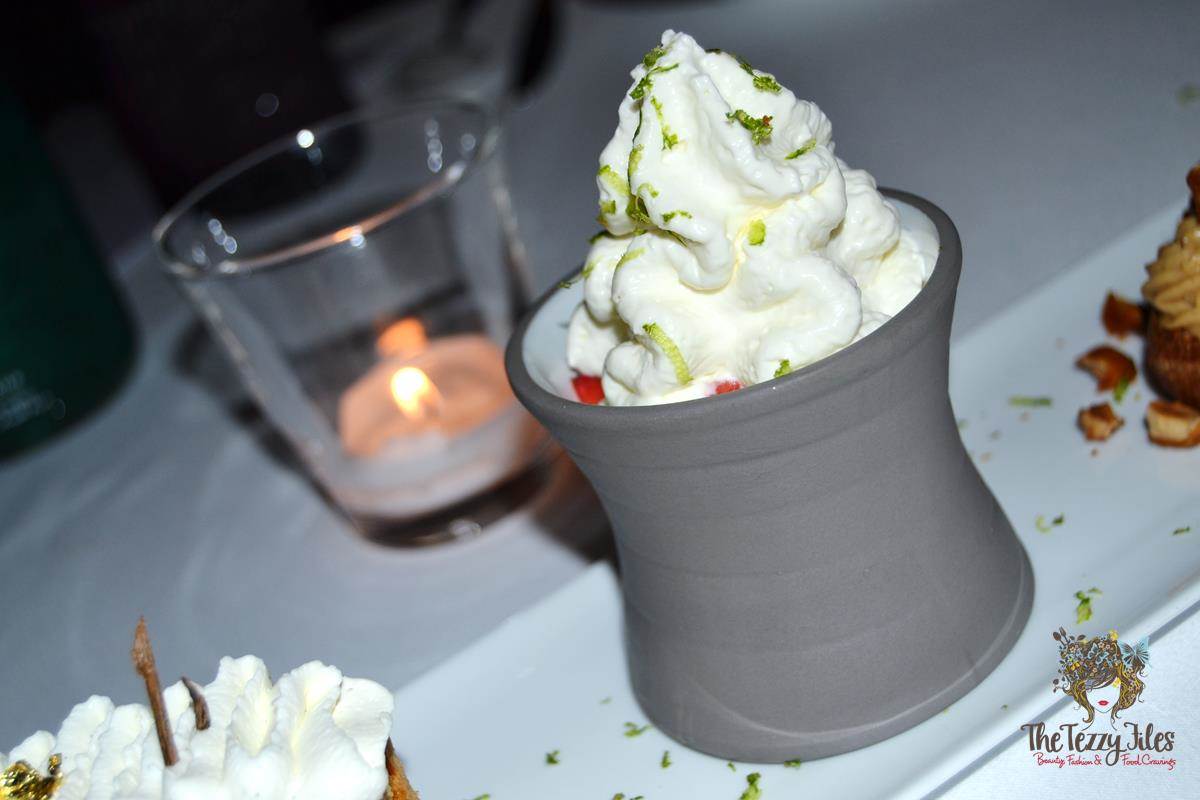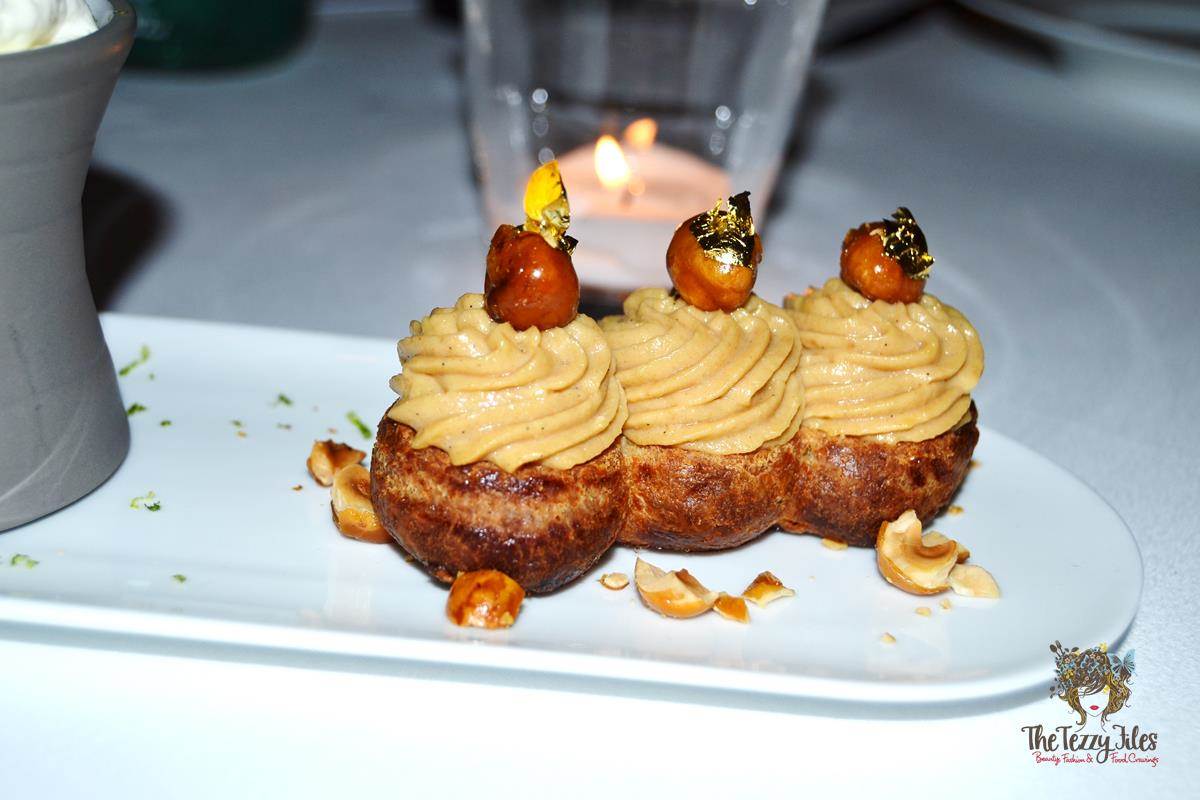 From all the three desserts on the platter, the Paris Brest stole the show. The pastry has been made from French-style choux dough, and filled with a very delicious praline cream. A caramelized macadamia nut sits pretty on the top garnished with edible gold leaf, and a surprise crunch of an almond is buried within this sinfully rich, nutty treat.