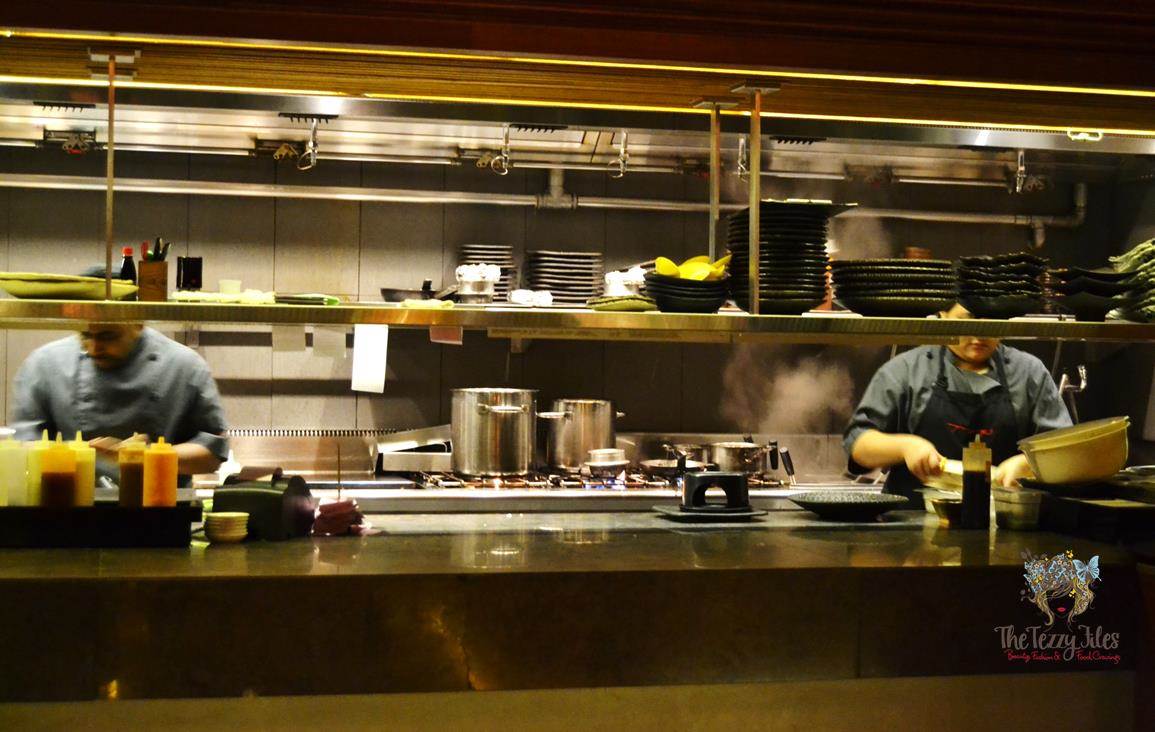 The dining area features an open kitchen, and gourmet chefs can be seen preoccupied in their culinary creations.