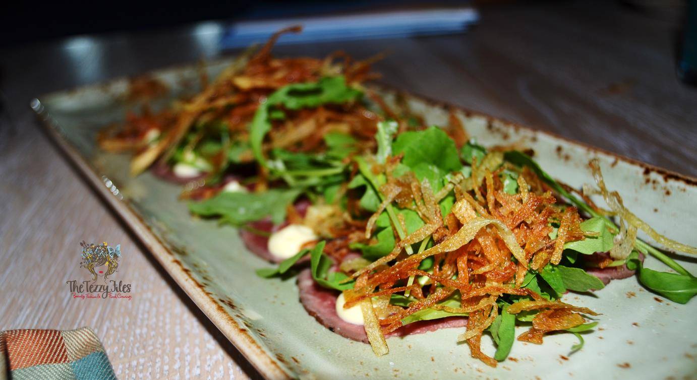 Meticulously thin slices of melt-in-the-mouth beef has been further accentuated with the decadence of truffle-infused mayo. A shroud of fresh rocket leaves acts as a generous garnish, and very finely shredded deep-fried potato crisps add texture to this delicious mouthful.