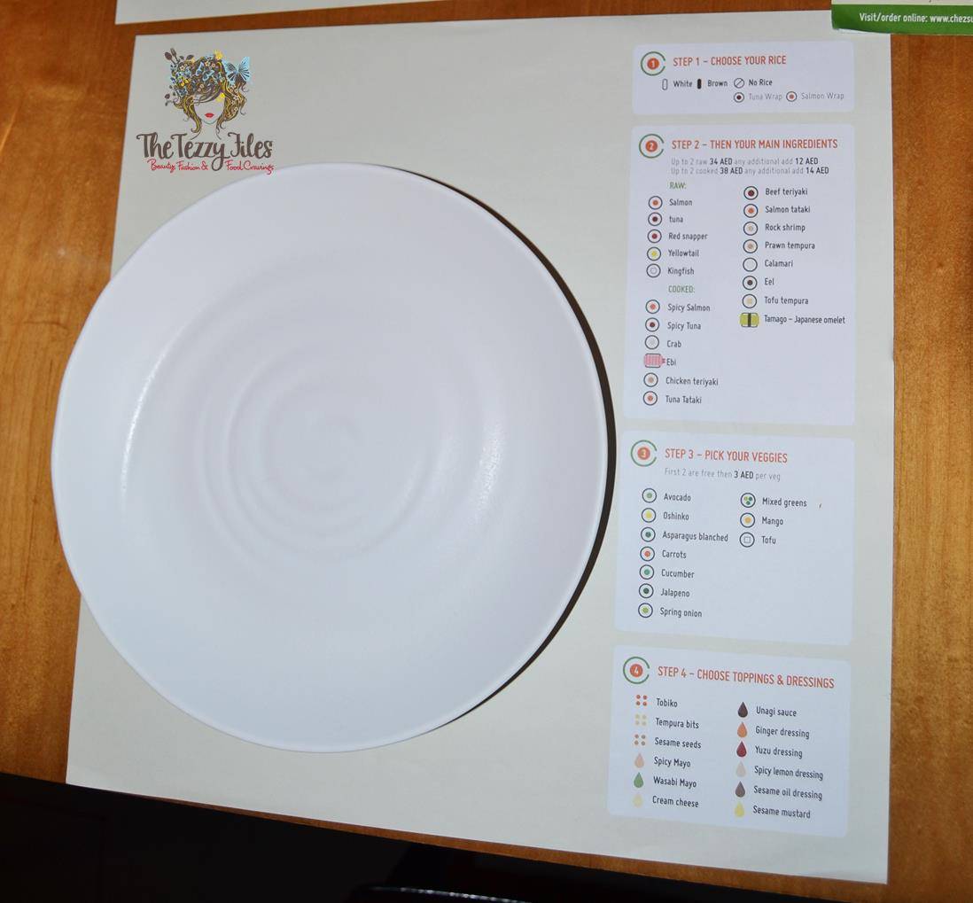 What makes Chez Sushi stand out from other sushi joints? You can let your creativity loose here, and create your very own rolls! The ‘Let’s Roll’ concept is clearly broken down into 4 steps on the table mats (as can be seen below):