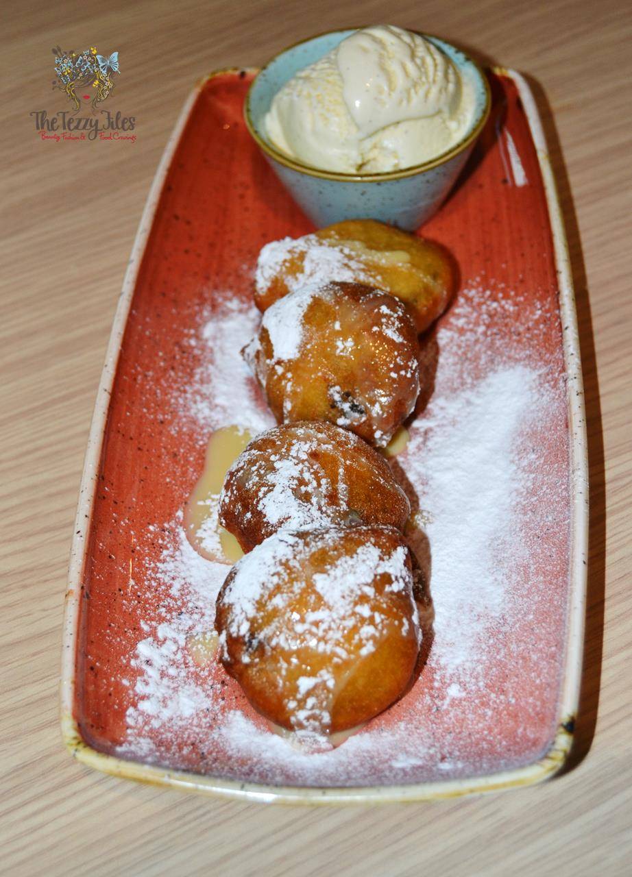 Oreo cookies have been battered in a special pancake mix, and deep fried to a crispy, indulgent golden brown. These moreish dumplings sit on little puddles of caramelized sauce, and are dusted with generous sprinklings of icing sugar. You really do need that pot of vanilla ice-cream on the side to take a break from all this richness!