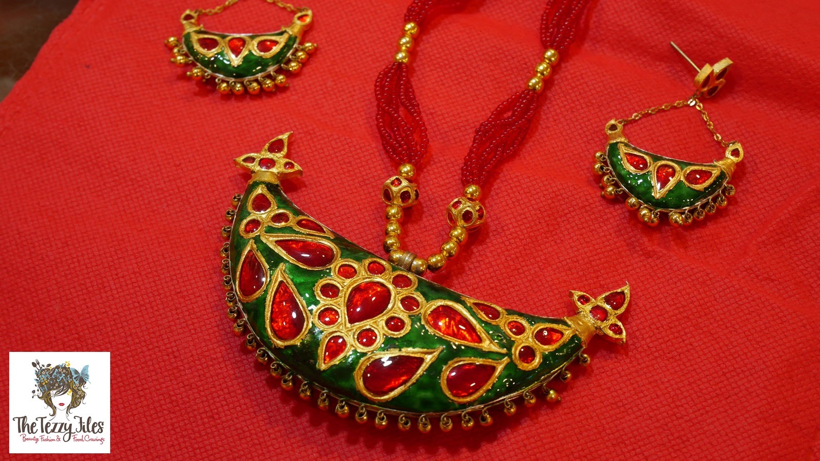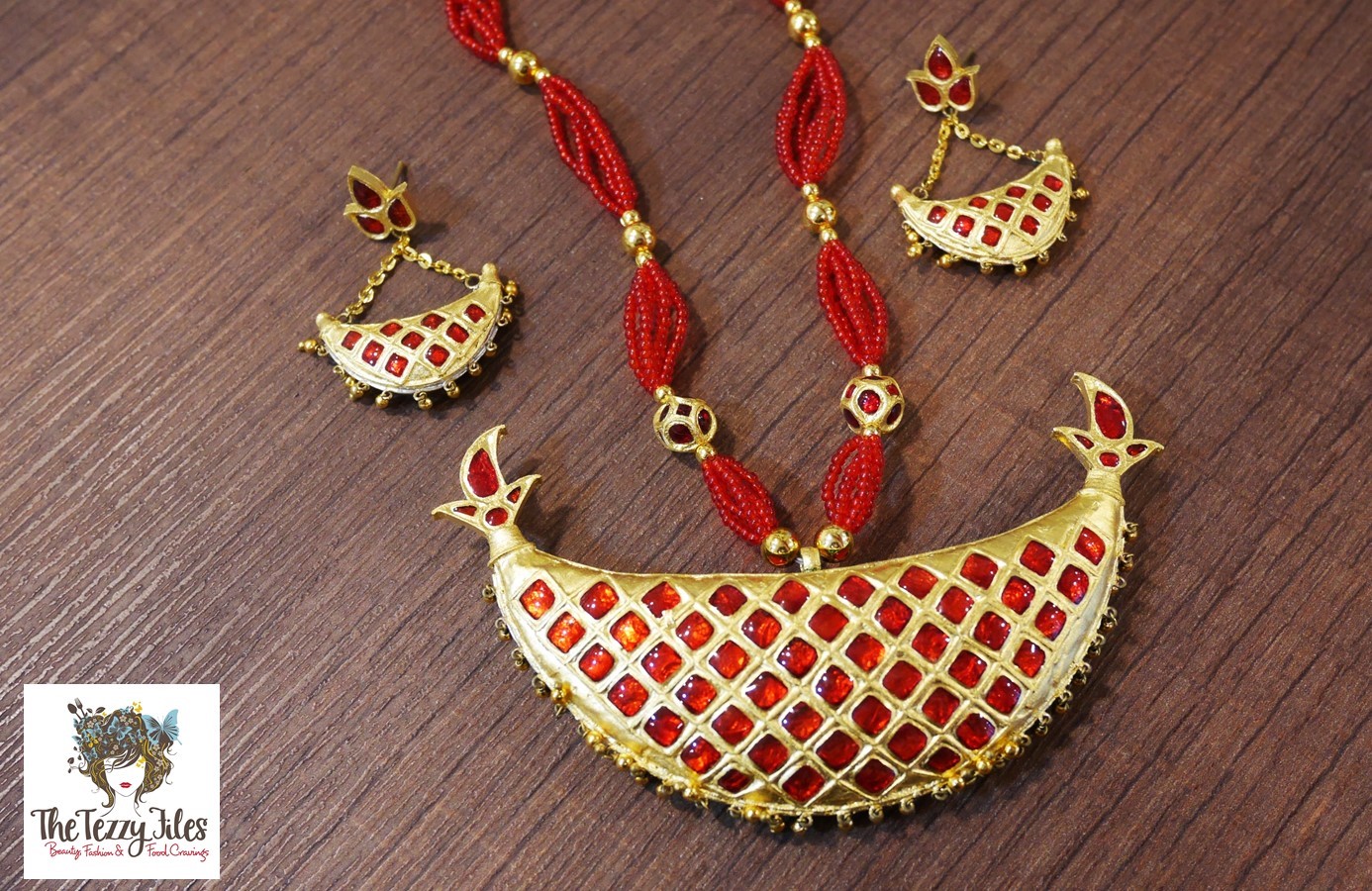Assamese jewelry is uniquely beautiful, and deserves to get more mainstream attention. This is a photo of a traditional ‘Dhool’. Shaped to look like an Assamese drum (or dhool), this piece is made of 22 carat gold and encrusted in rubies.