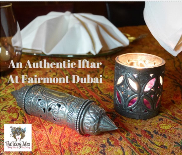 We experienced the grand Iftar spread at Summit, Fairmont Dubai’s exclusive conference hall, set on the 33rd floor. An elaborately long dining table was set, laid with a very traditional Bedouin-print table-cloth and adorned with silver trinkets that one might collect on an exotic holiday exploring the Middle East.