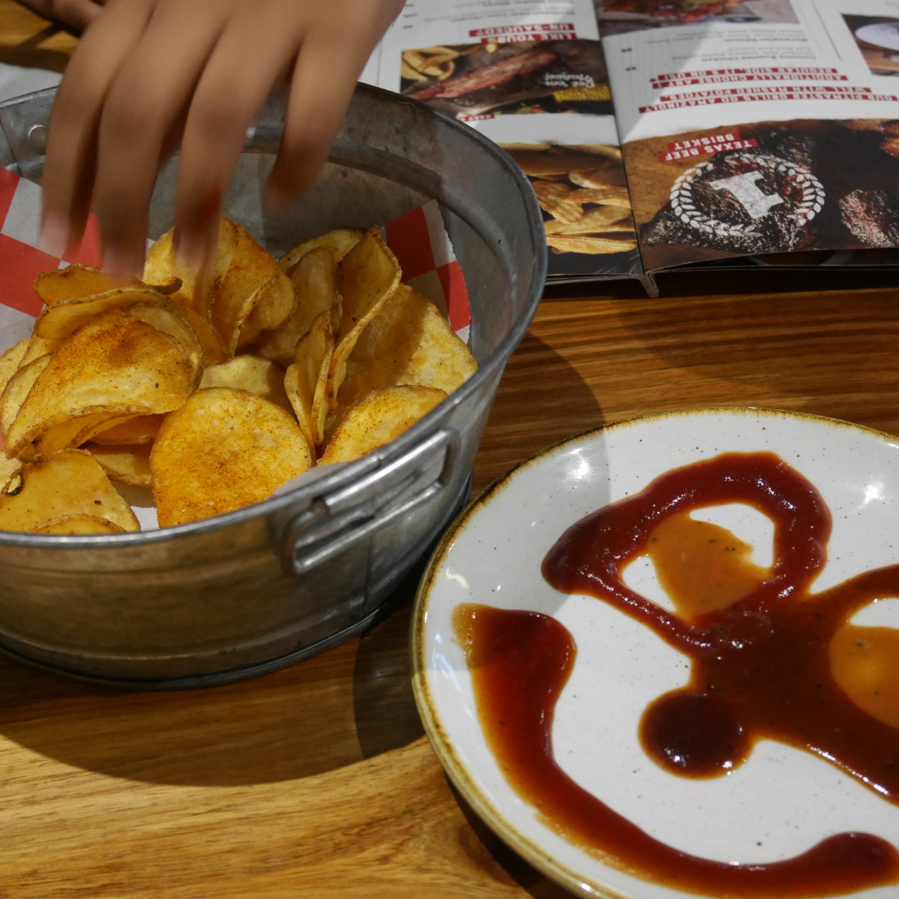 Each table at Famous Dave’s has squirt-bottles of his famous sauces, and the server makes a big fanfare of these by introducing each sauce onto a platter as he draws out a saucy smile.