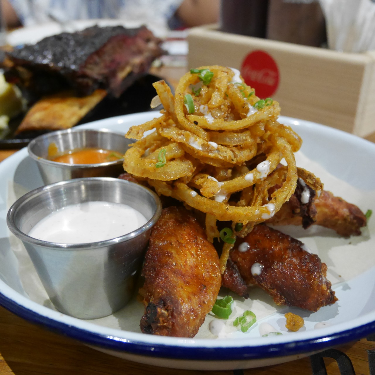 We also had a platter of ‘Wings & Rings’ and asked to have them ‘naked’ so that we could try all three options of the sauces on the side. Both Farasha and I would suggest the Honey Chili sauce.