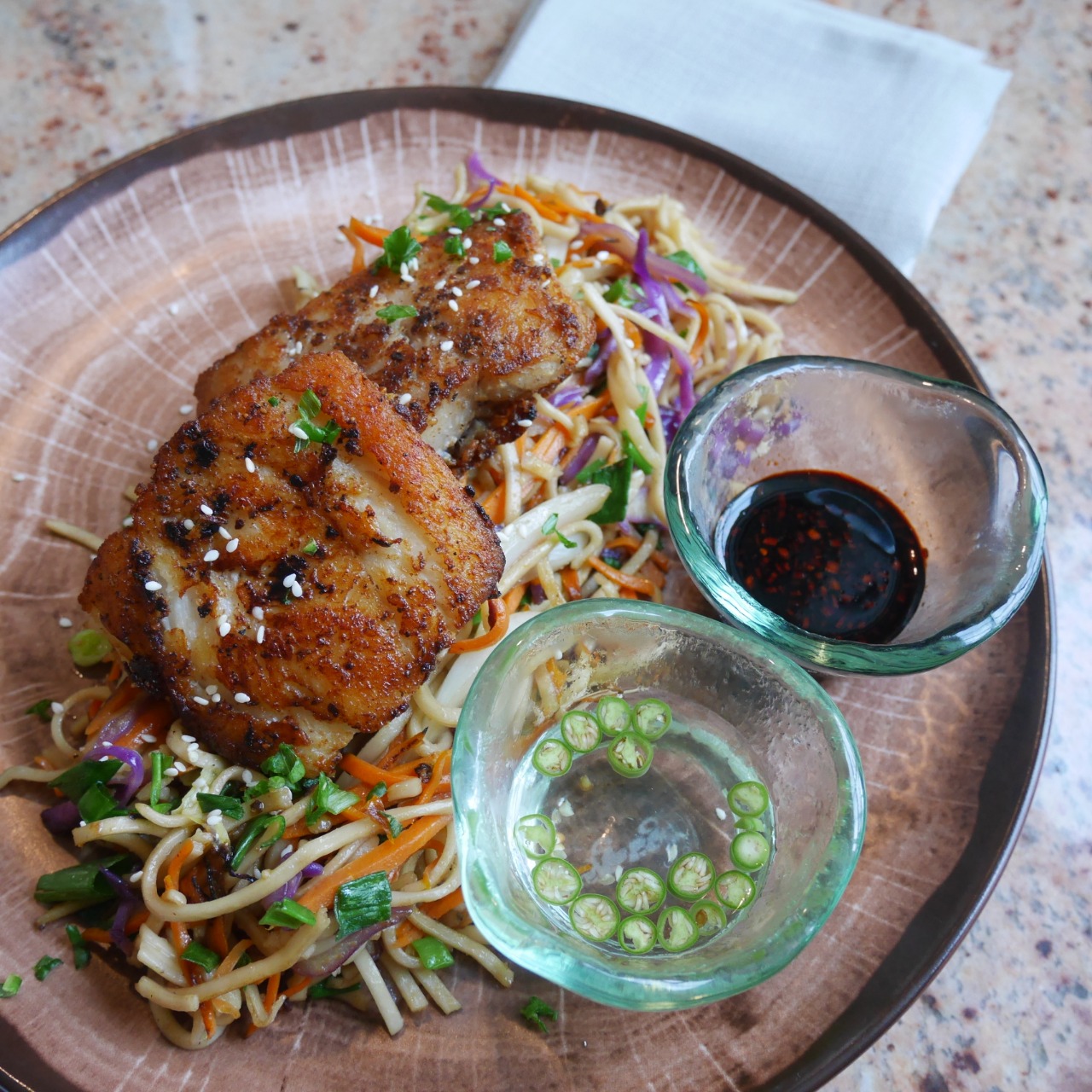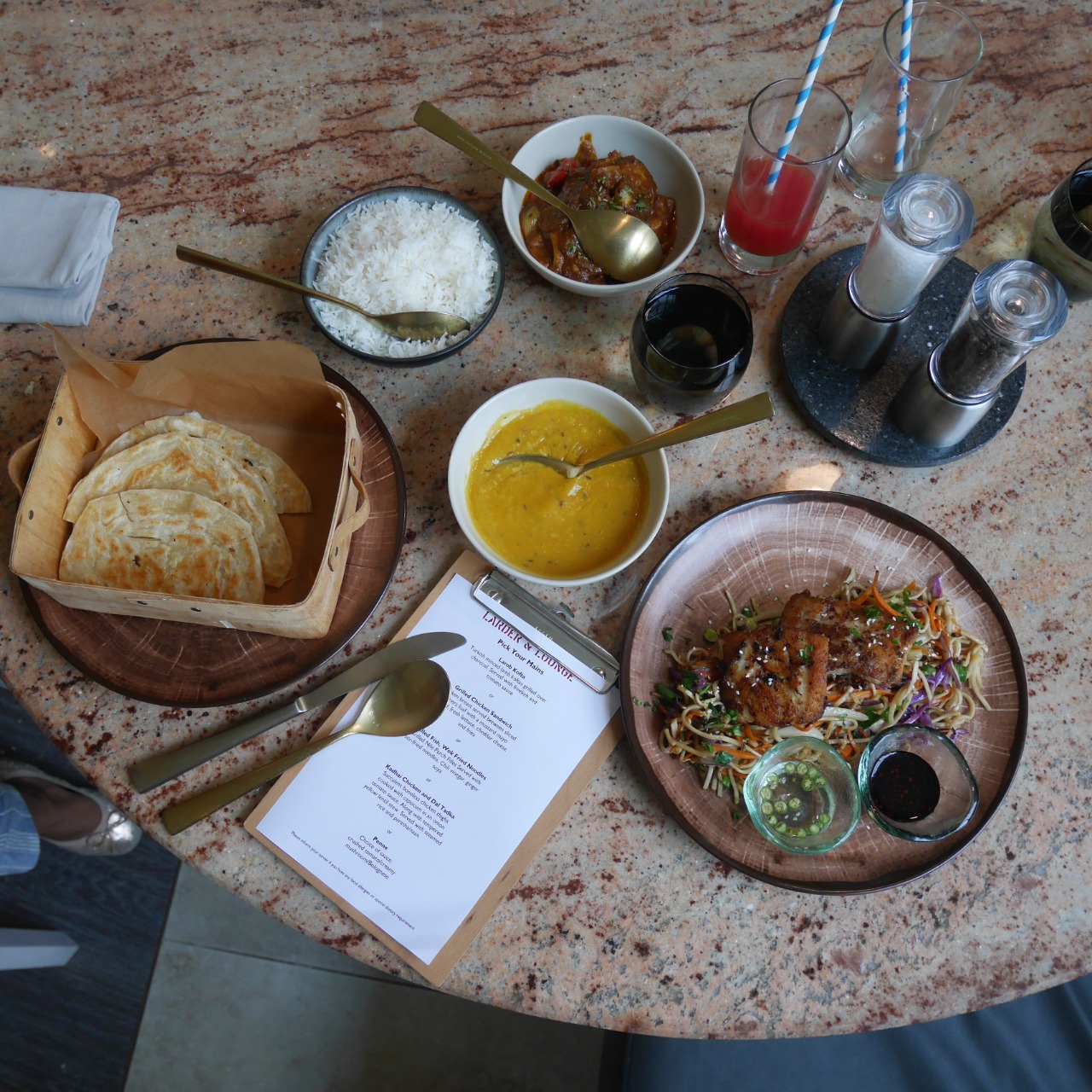 I went for the grilled fish and stir-fried noodles, and my daughter had the Kadai Chicken which came with a bowl of rice, daal and paratha. The portion sizes here are generously large. We could have easily shared a main-course between the two of us.