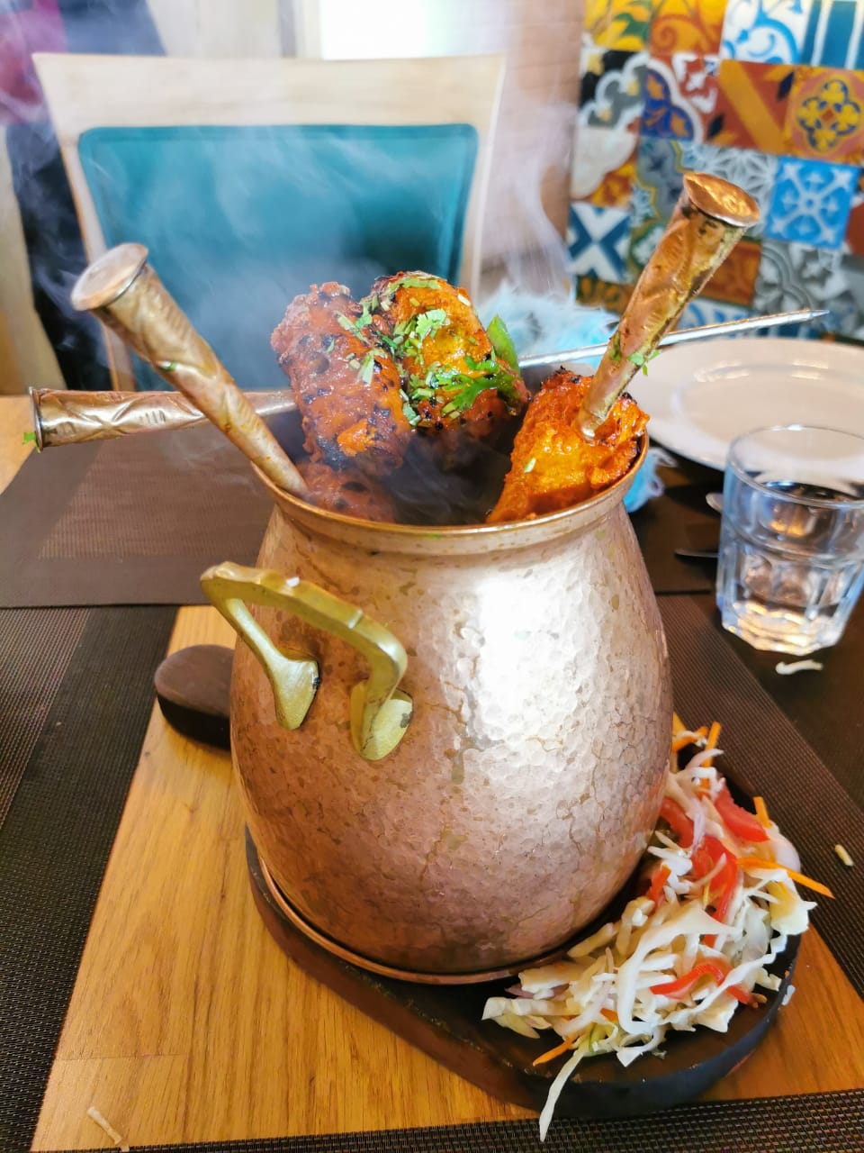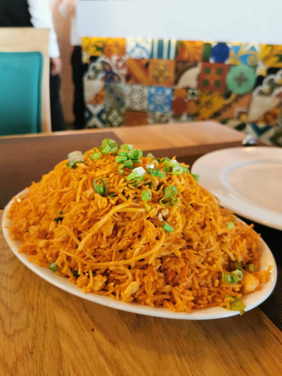 The ambiance at Masala Wok is invitingly colorful, complete with antique furniture juxtaposed with bright hand-painted tiling and quirky quotes.