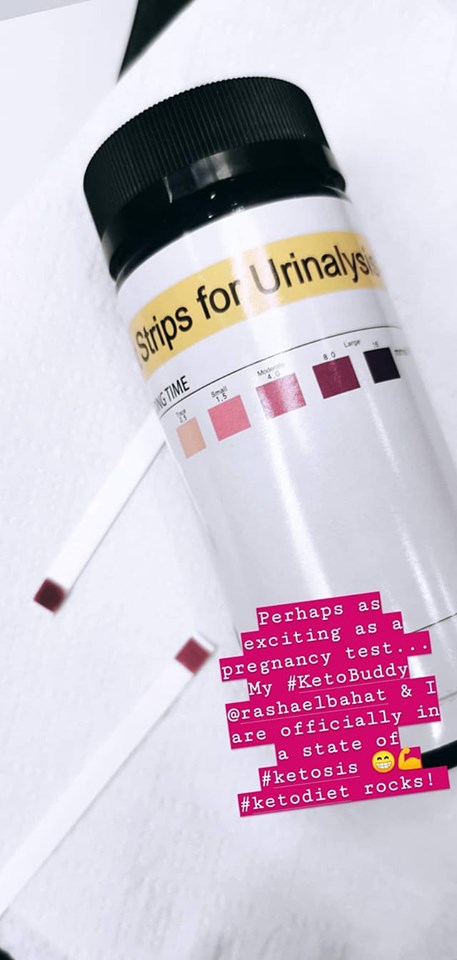 - We did the Keto urine test: Rasha bought the Keto urine test strips from Amazon.ae The only form of urine strips I’ve used before were in a pregnancy test kit, and this was just as exciting! Both Rasha and I scored 8 as you can see below. Our bodies are definitely ketone heavy and going into ketosis! To fool-proof it, Rasha let her Hubby try one and he came clean and clear.
