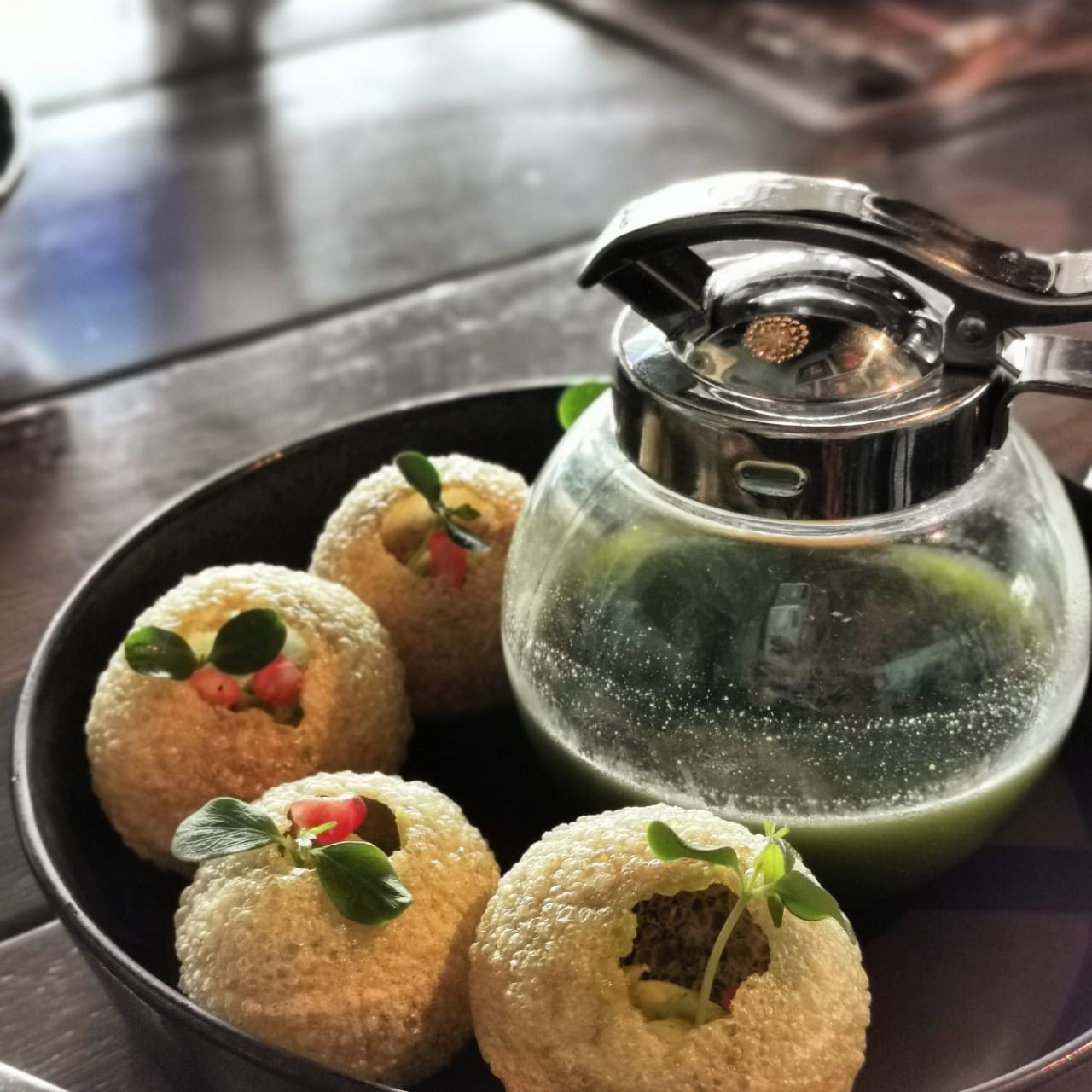 Guac Pani Puri: This is a Bombay Bungalow star dish and remains one of my all-time favorites. Traditional potato has been replaced with guacamole, and the ‘pani’ is already preblended with mint and tamarind. It’s like a Mexican meets Indian, and the ironic part was we had a Mexican colleague at the table, sharing his puris with the Indian friend seated next to him!
