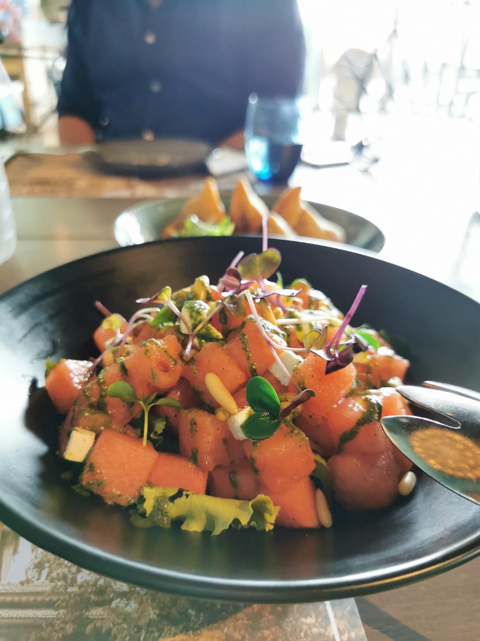 Watermelon Chaat: I chose this starter for myself. It is a clever take on the Mediterranean watermelon and feta salad as it has been mildly spiked with a hint of Indian chaat masala. It is refreshingly delicious, and the creamy bits of feta make it moreishly good.