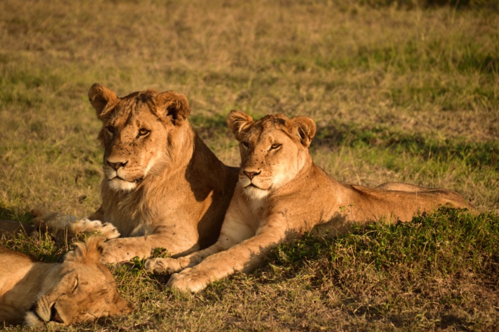 Two regally poised lionesses sat by his side, but his majesty was in deep slumber. Even the king of the jungle was having a tiring day.