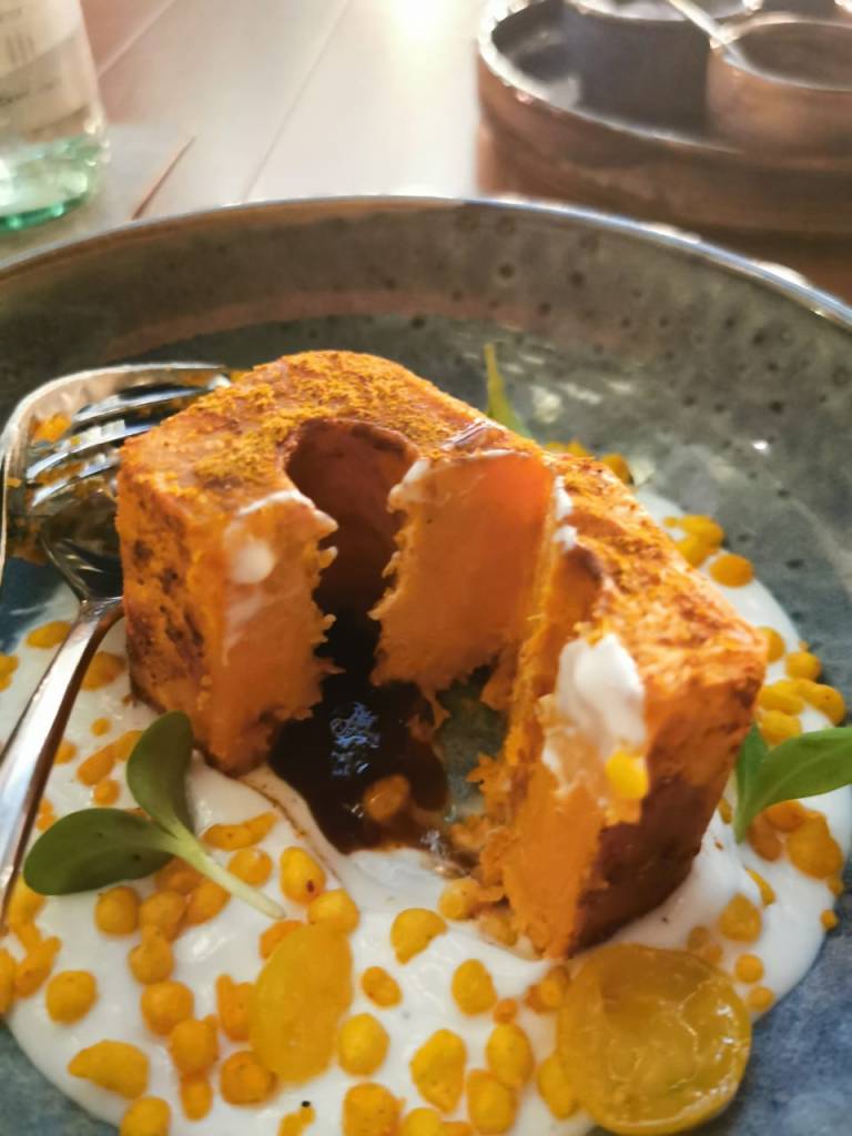 For our starters, I went for the Shakarkandi Ki Chaat. This is a clever twist on the traditional potato chaat as it uses sweet potato that has been smoked with sandalwood, and regular yoghurt has been replaced with Arabic labneh and enhanced with a special strawberry-ginger dressing. This was a delicious start to the meal.