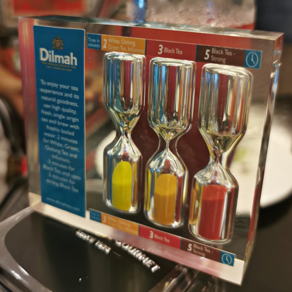 At the t-Lounge by Dilmah, you can also buy a range of beautiful tea-making tools like this set of pretty sand clocks to help you brew the blend to the strength you desire. They also have Dilmah branded teapots and collectible antique-style cups and saucers.
